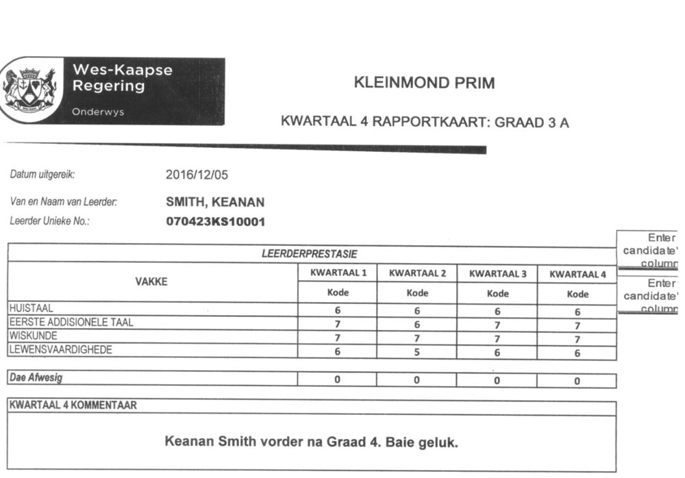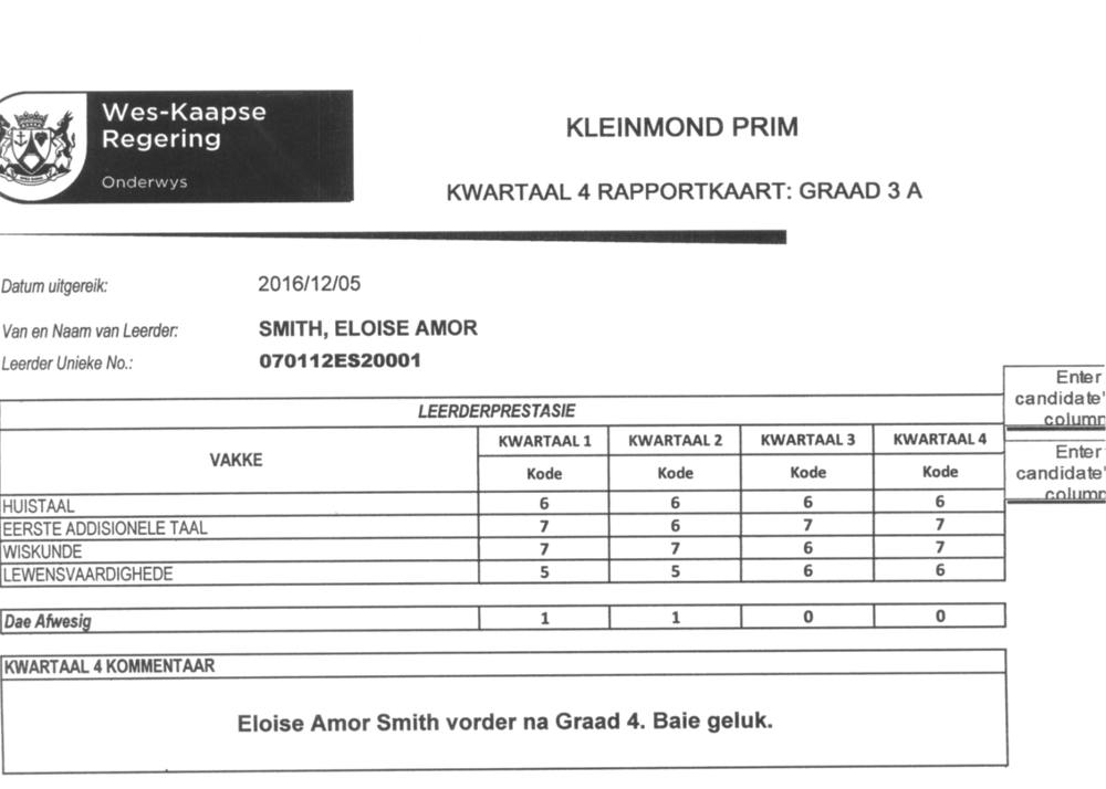 2016 REPORT CARDS OF PENGUIN KIDS NOWATTENDING PRIMARY SCHOOL