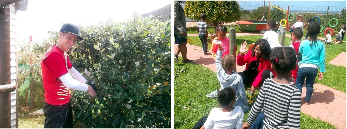 A group of volunteers from Grove arrived and immediately started weeding & trimming the Tarconanthus in the play area/garden.. Of course, the children were very interested and were just dying to lay their hands on the implements. They, also, donated sacks of mealie meal and catering-size tubs of peanut butter and spreads towards our feeding scheme supplies. Our sincere gratitude for your profound genrosity in better caring for our most precious asset :OUR CHILDREN: