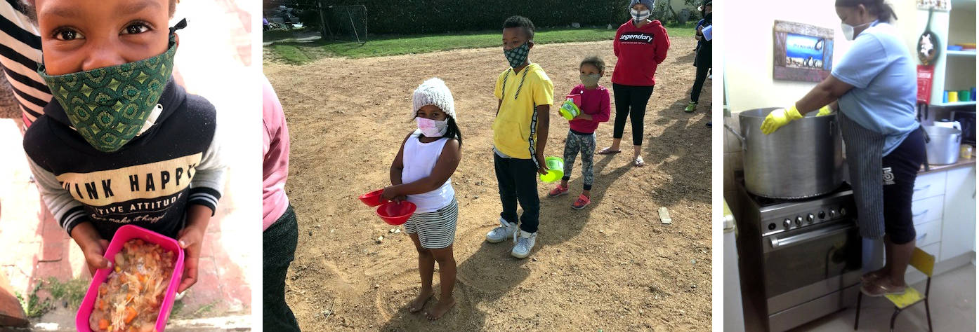 Everyone brings their own container and queues outside the community hall in masks and at the proper distance from one another. While serving the teachers have a chance to speak to each child to pick up abuse or neglect.