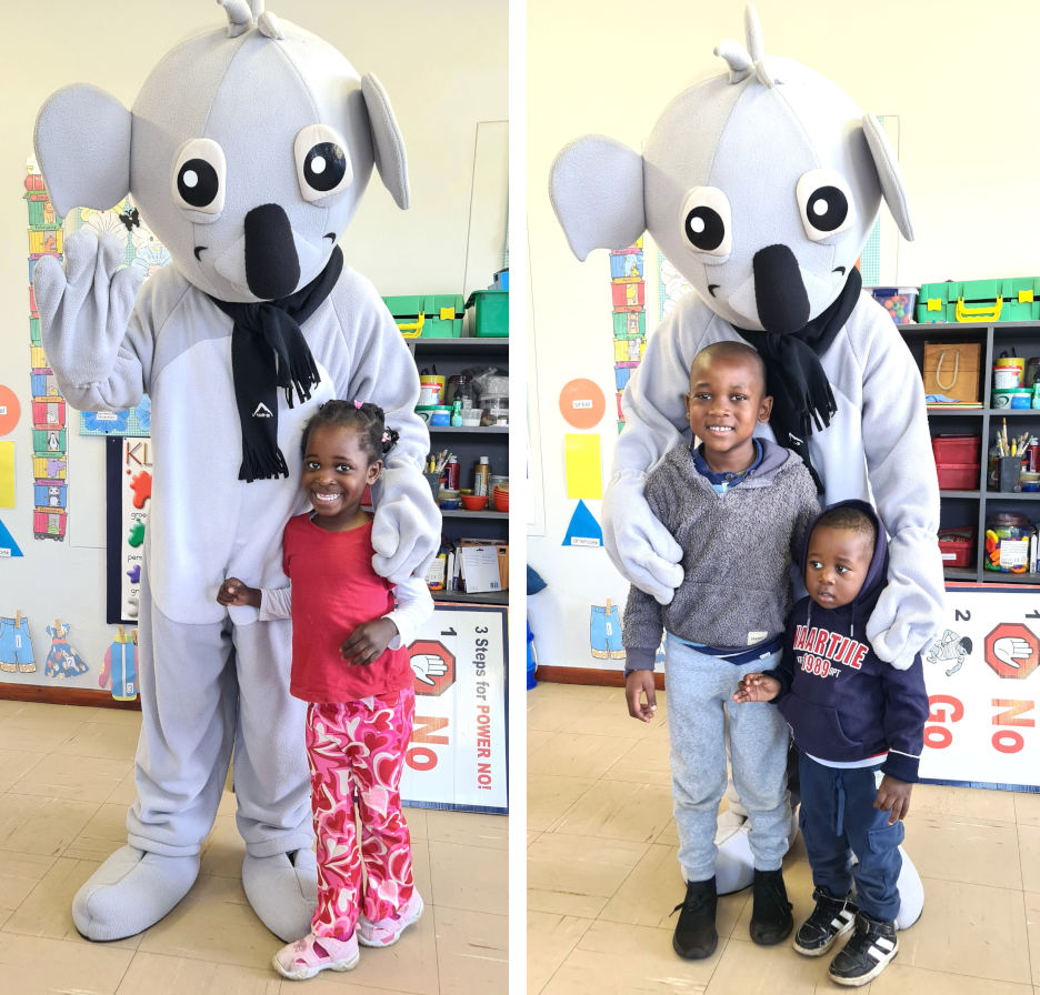 The children were much surprised when an unusual visitor shuffled into the room where they were seated, greeted them and introduced himself as KC Koala. They quickly realised though that they were going to have fun because he taught them a game everyone loved. Before they even began to get tired, he had them all sit down again to listen to a story. They learned songs too which made them all laugh. The teachers who were watching laughed too and everyone had a very happy time.